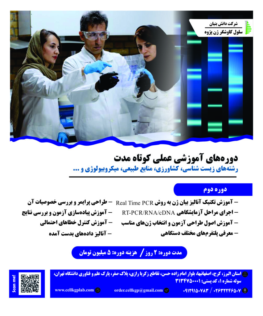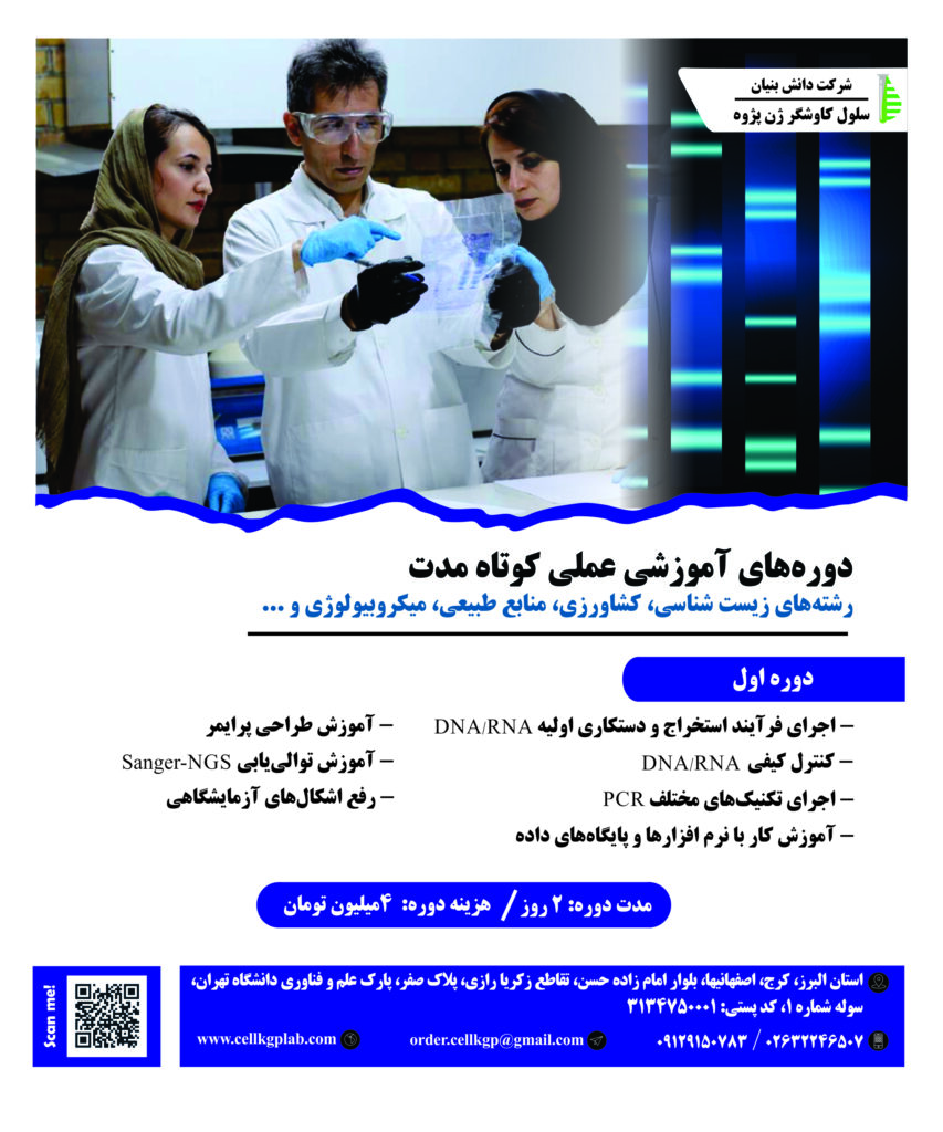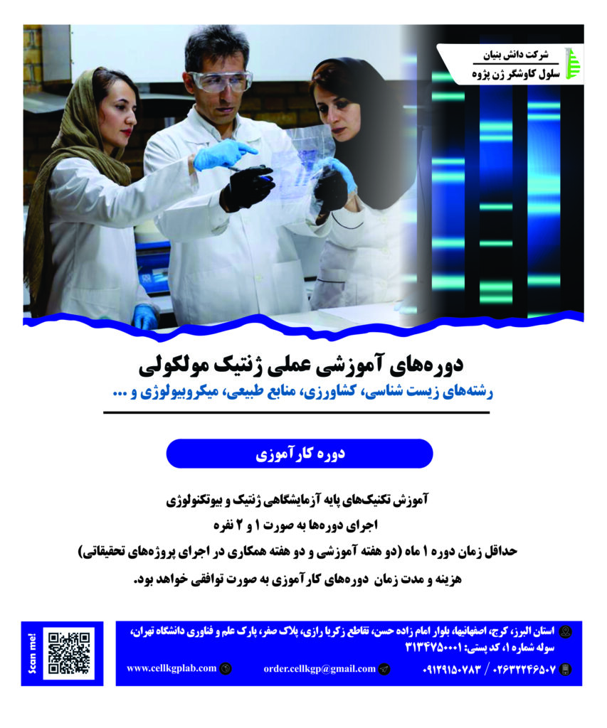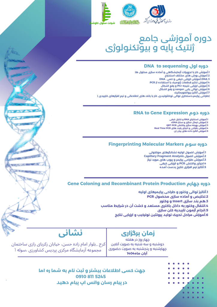 شرکت سلول کاوشگر ژن پژوه اقدام به برگزاری دوره های آموزشی ژنتیک مولکولی به صورت دوره های کاراموزی 1 ماهه می نماید. متقاضیان پس از آموزش های کامل آزمایشگاهی، در اجرای پروژه های تحقیقاتی همکاری موثر نموده و در پایان تسلط کامل خواهن داشت. هزینه این دوره کاراموزی به نوع تکنیک های آزمایشگاهی مورد درخواست بستگی داشته و به شکل توافقی خواهد بود. لذا از طریق لینک زیر فرم ثبت نام در کارگاه های آموزشی  را تکمیل نمایید و به آدرس Order.Cellkgp@gmail.com ارسال نمایید. زمان برگزاری در تمام طول سال بوده و متقاضی بر اساس برنامه زمان بندی شده توافقی حضور خواهد داشت.