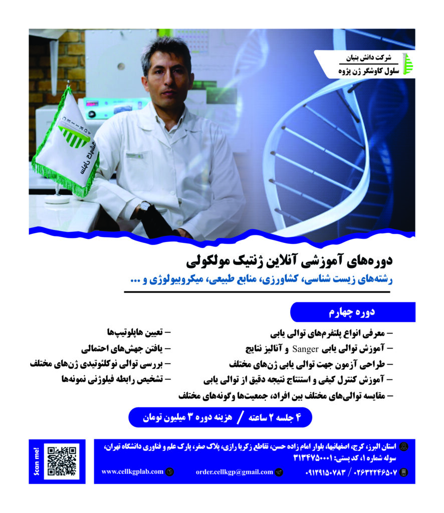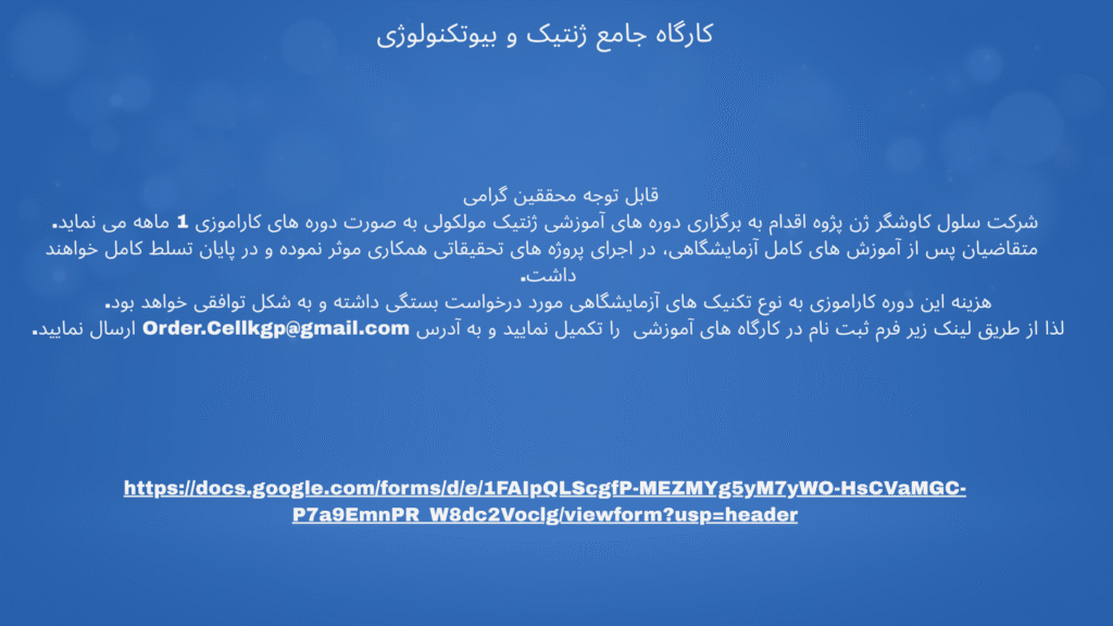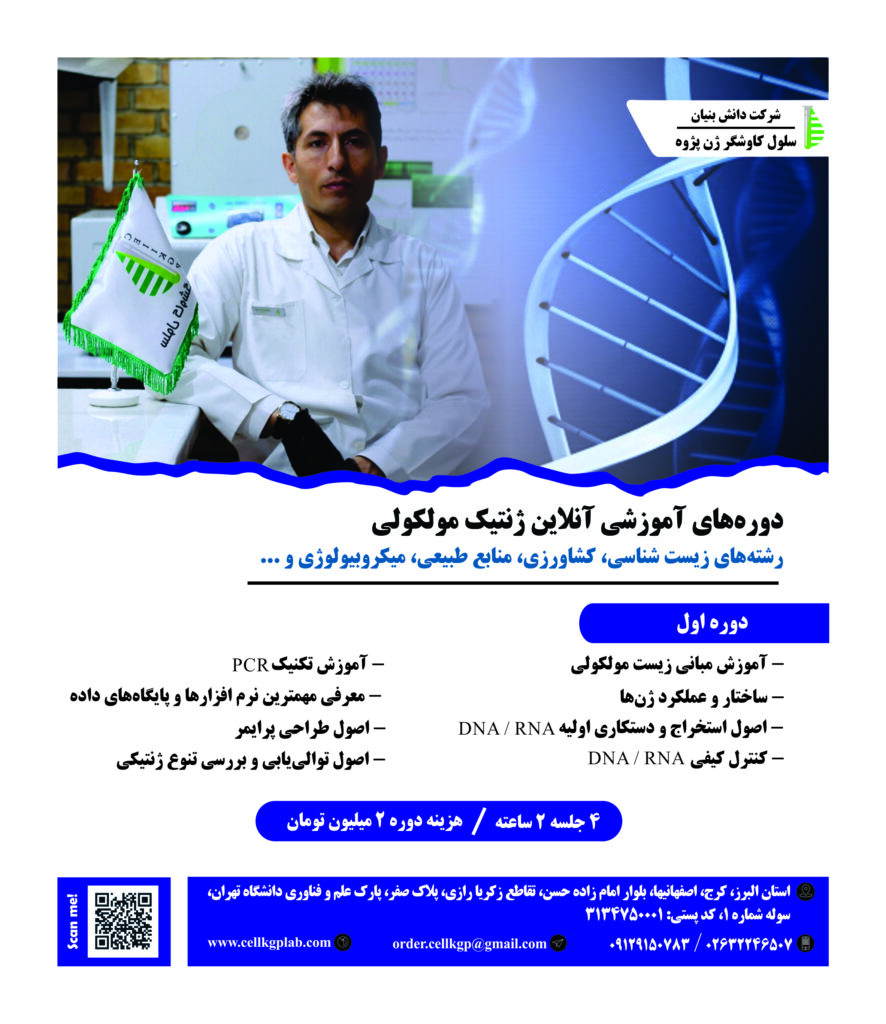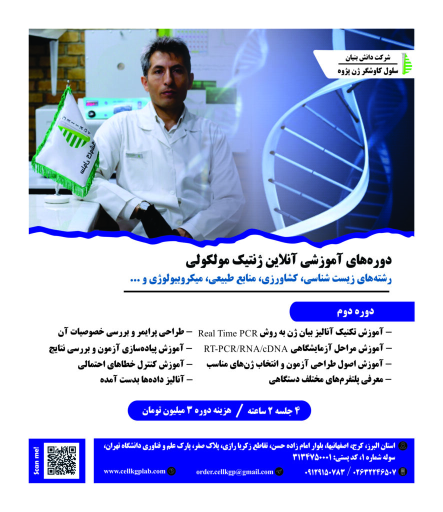 شرکت سلول کاوشگر ژن پژوه اقدام به برگزاری دوره های آموزشی ژنتیک مولکولی به صورت دوره های کاراموزی 1 ماهه می نماید. متقاضیان پس از آموزش های کامل آزمایشگاهی، در اجرای پروژه های تحقیقاتی همکاری موثر نموده و در پایان تسلط کامل خواهن داشت. هزینه این دوره کاراموزی به نوع تکنیک های آزمایشگاهی مورد درخواست بستگی داشته و به شکل توافقی خواهد بود. لذا از طریق لینک زیر فرم ثبت نام در کارگاه های آموزشی  را تکمیل نمایید و به آدرس Order.Cellkgp@gmail.com ارسال نمایید. زمان برگزاری در تمام طول سال بوده و متقاضی بر اساس برنامه زمان بندی شده توافقی حضور خواهد داشت.